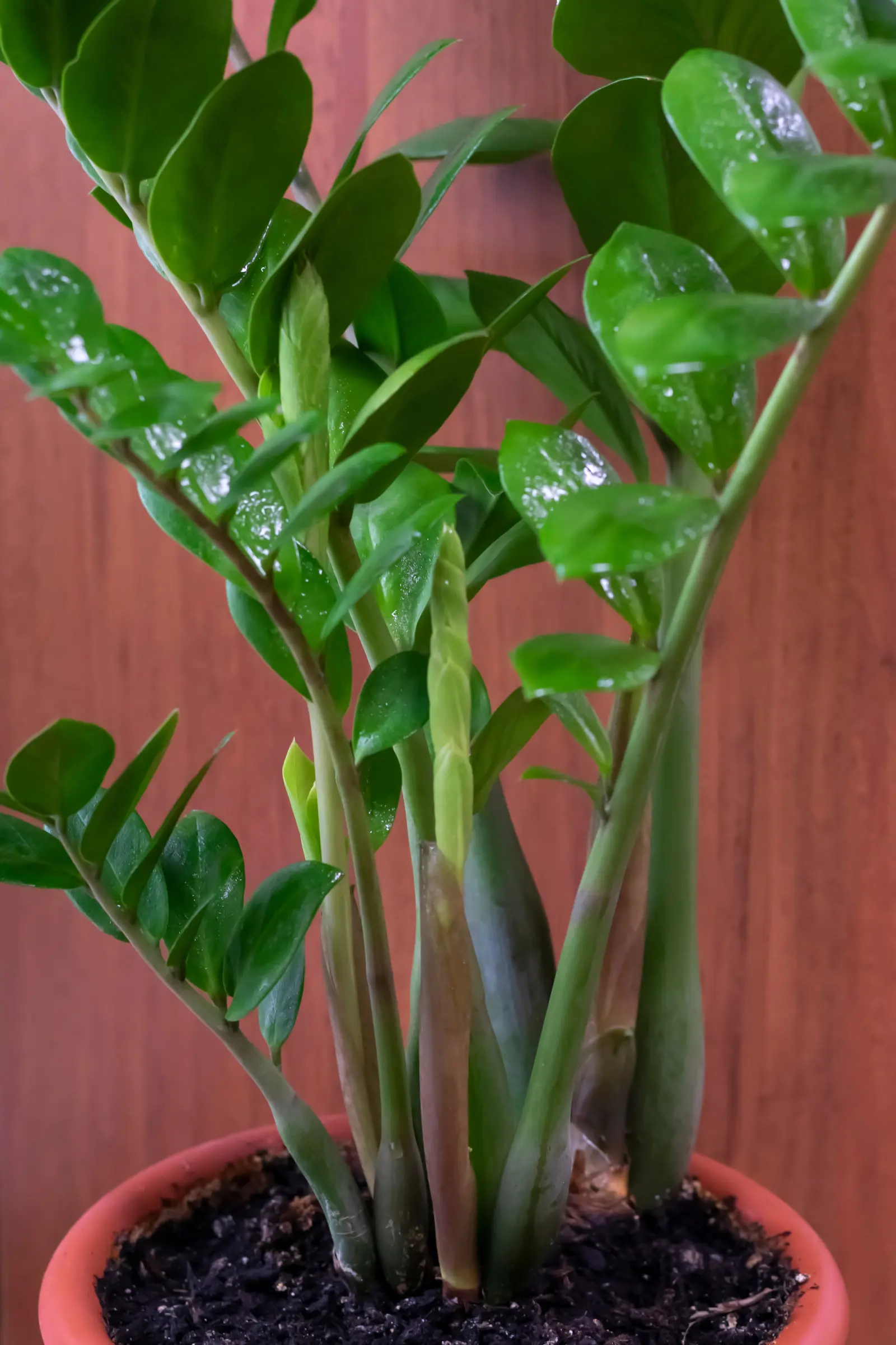 Jeśli przyglądasz się swojemu zamiokulkasowi i zauważasz u jego podstawy grube, stożkowate pędy o spiralnym kształcie, masz do czynienia z młodymi liśćmi. Wyglądają trochę jak zielone szyszki, bo są ciasno zwinięte i pokryte kroplami wilgoci – typowy widok, gdy roślina wypuszcza nowy przyrost.