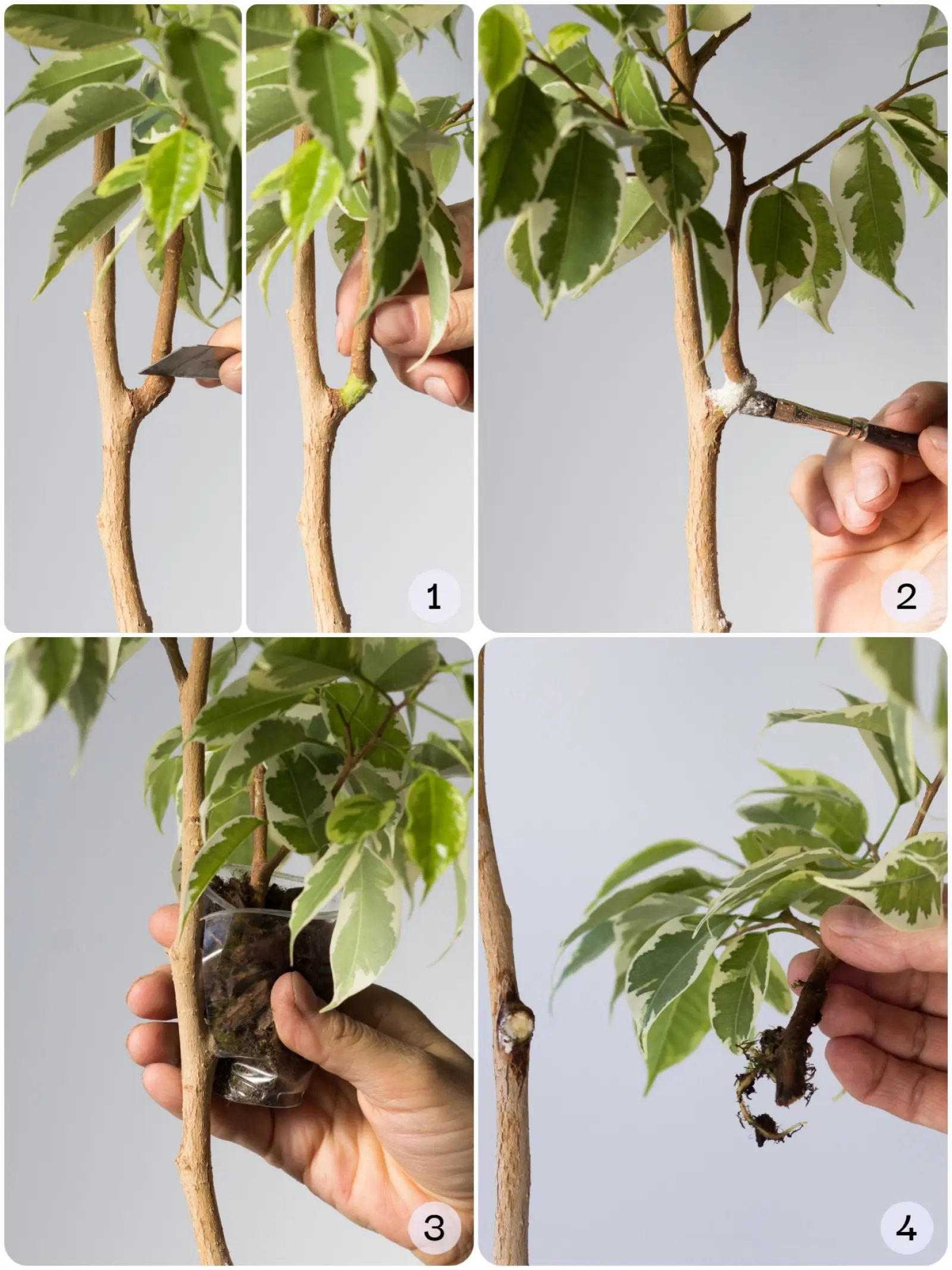 Najpierw trzeba pobrać odpowiedni fragment pędu. Najlepiej sprawdzają się wierzchołkowe sadzonki długości ok. 5-15 cm, z kilkoma liśćmi u góry i odsłoniętym fragmentem łodygi na dole. Dolne liście należy usunąć, aby nie gniły w wodzie, a po cięciu dać pędowi chwilę na obeschnięcie, bo fikus wydziela biały, lepki sok.