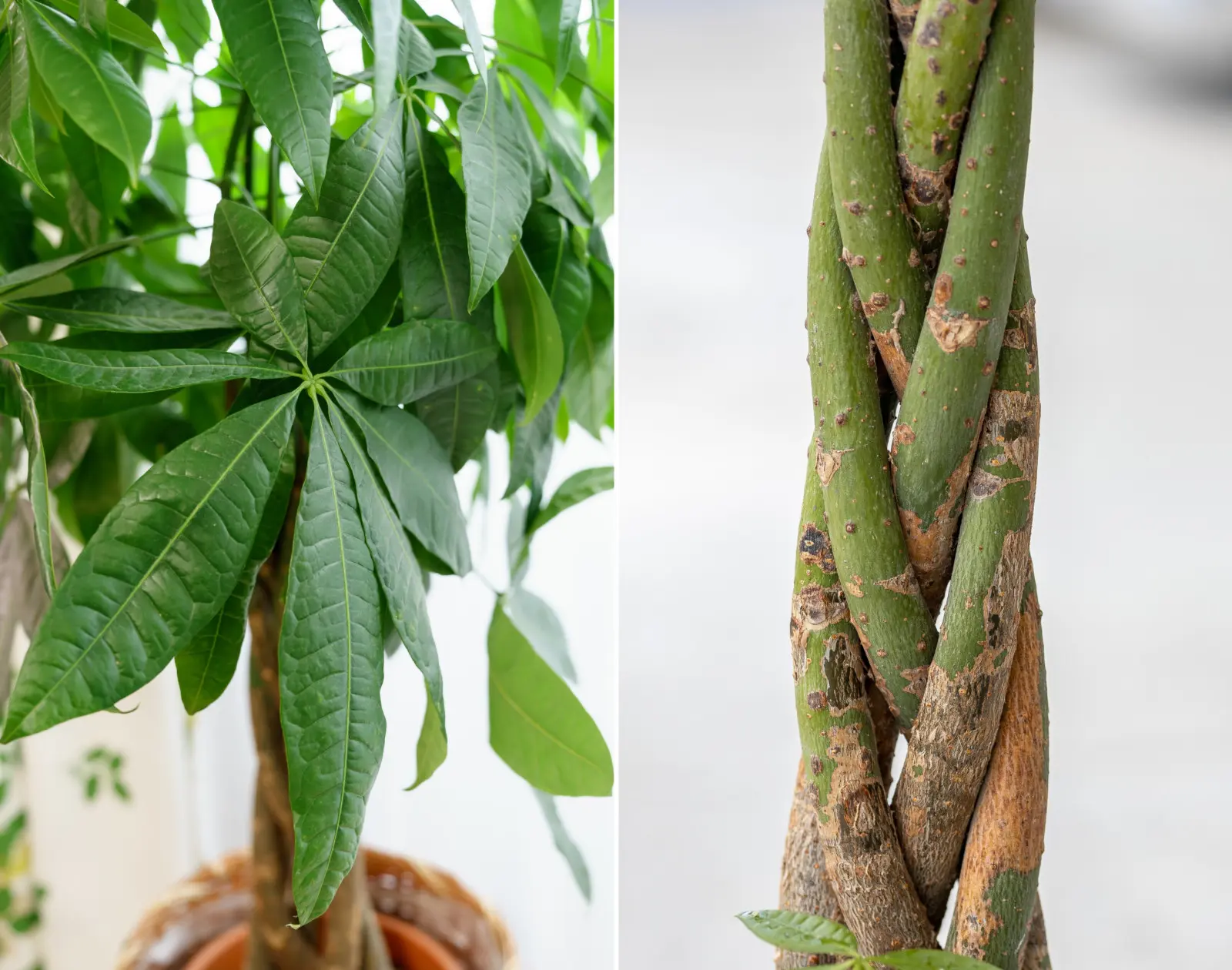 Ten element wzbudza najwięcej pytań i… nie ma z nim nic wspólnego natura. Zapleciony pień to efekt pracy człowieka, a nie naturalny sposób wzrostu rośliny. W doniczkach sadzi się kilka młodych sadzonek bardzo blisko siebie i już na wczesnym etapie wzrostu delikatnie splata ich pędy. Z czasem grubieją, zrastają się i tworzą charakterystyczny warkocz, który dziś uznawany jest za znak rozpoznawczy pachiry. Warto wiedzieć, że takie zaplatanie nie szkodzi roślinie, o ile nie jest zbyt ciasne i nie ogranicza przepływu soków. Starsze egzemplarze mogą mieć pień już niespleciony lub tylko częściowo uformowany – i to również jest całkowicie normalne.
