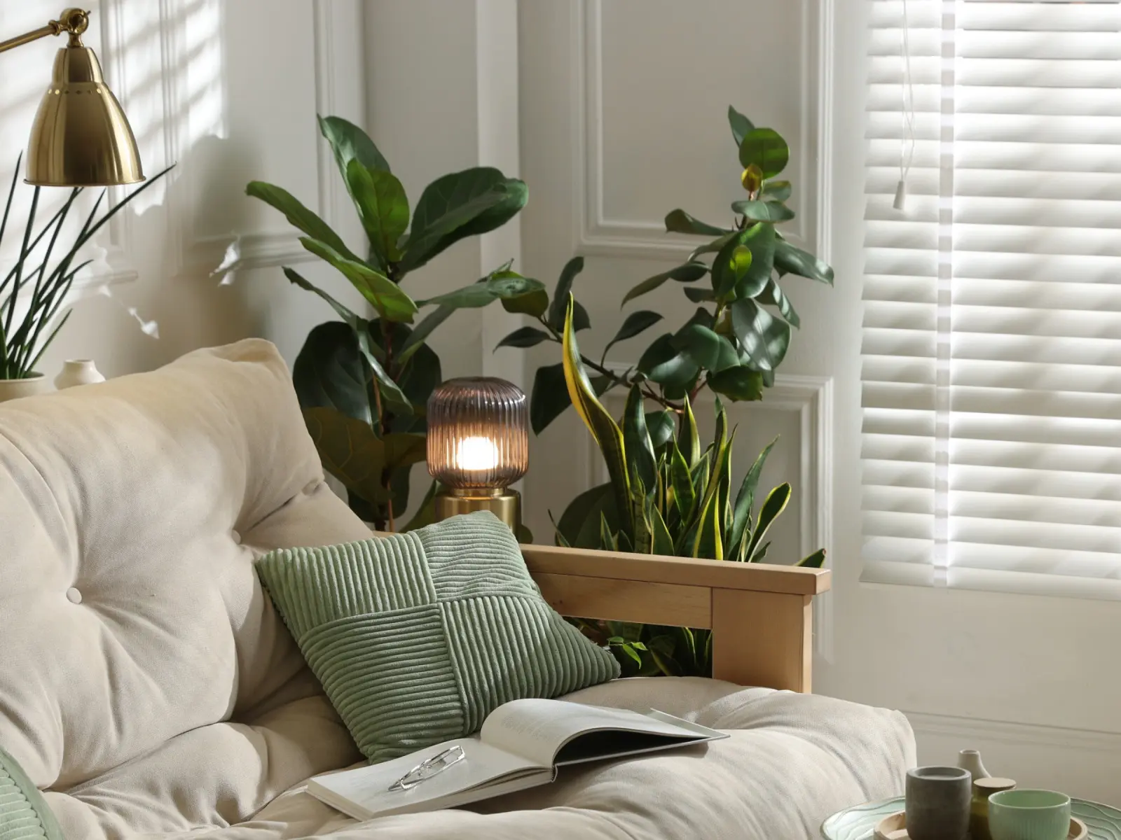 Warunkowo do tej grupy można zaliczyć także paprocie oraz skrzydłokwiat – pod warunkiem, że róg nie jest skrajnie ciemny ani suchy. W trudniejszych warunkach szybciej tracą estetykę niż rośliny o sztywniejszym pokroju.