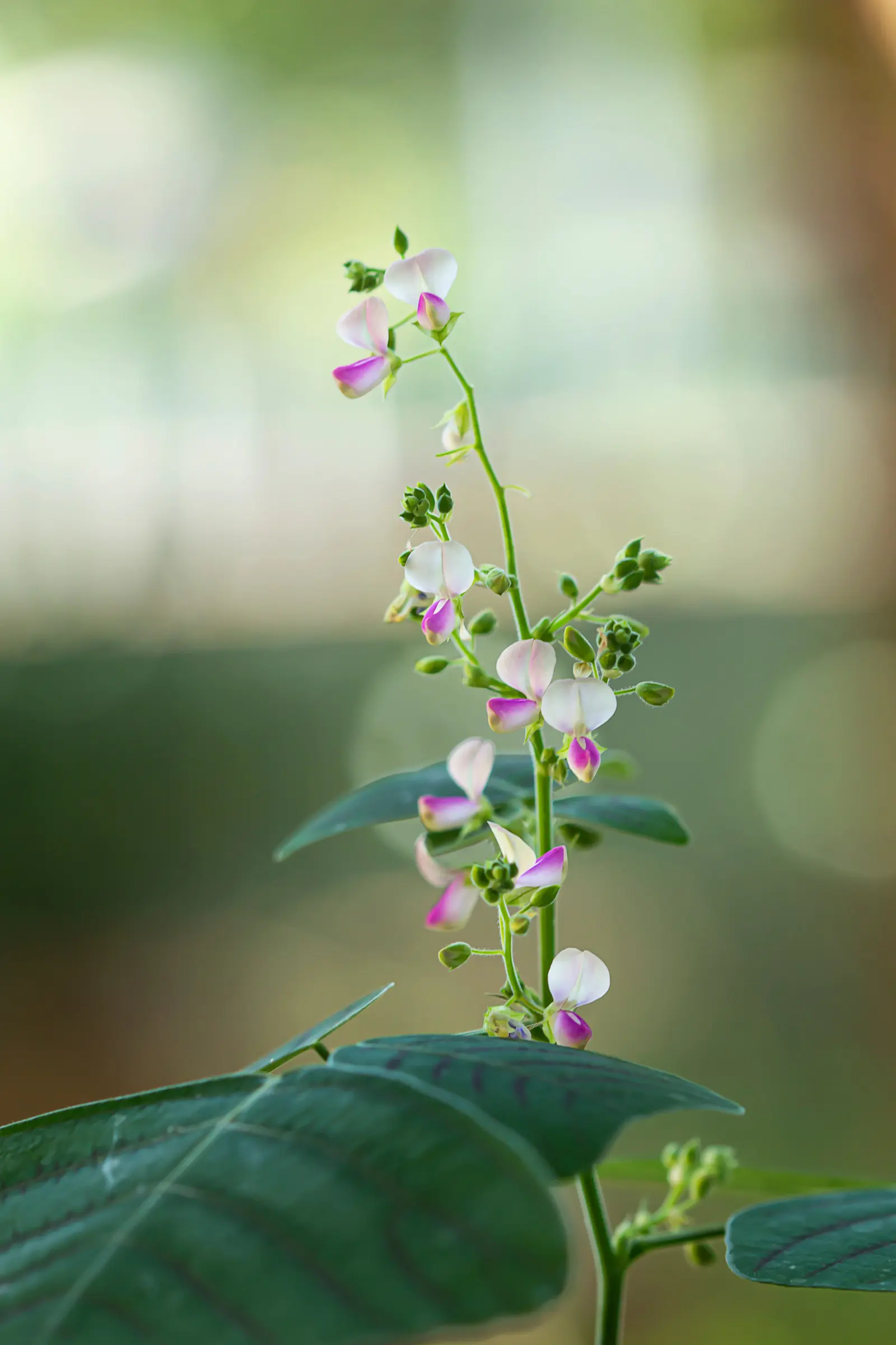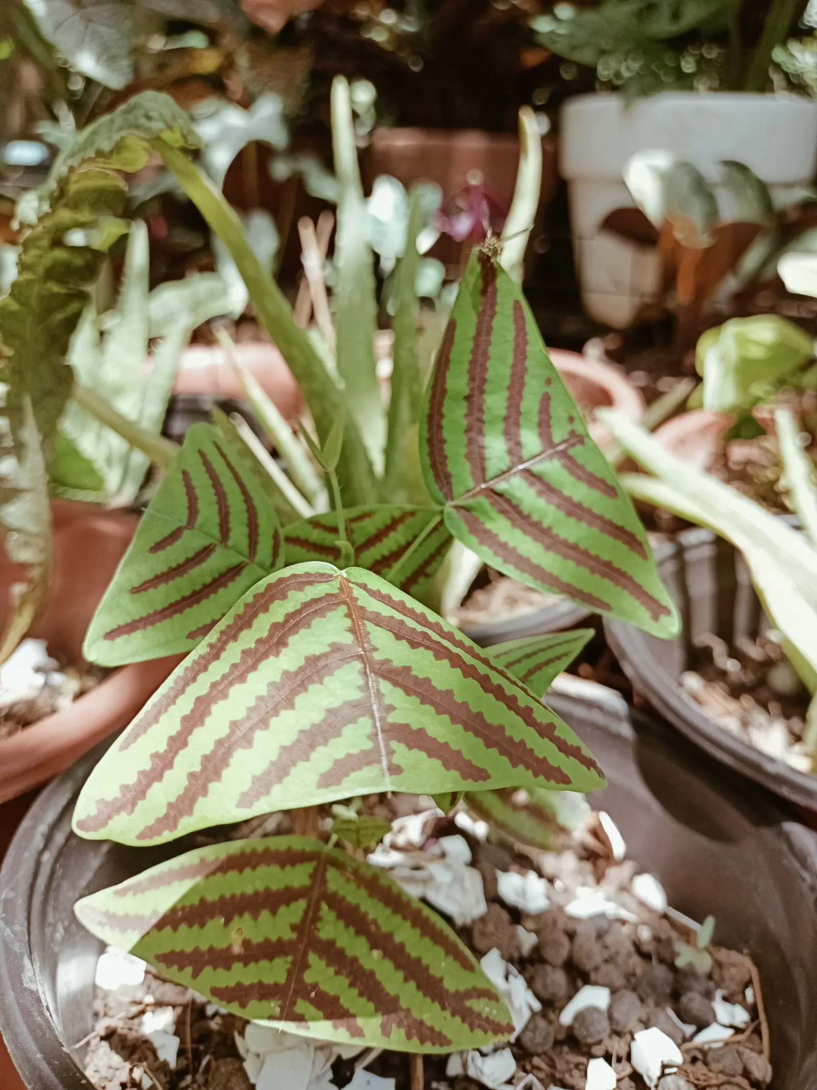 Największą ozdobą są trójkątne liście z wyrazistymi, zielono-bordowymi pasami, które do złudzenia przypominają rozpostarte skrzydła motyli. Ruchliwe, cienkie pędy poruszają liśćmi przy każdym podmuchu powietrza, potęgując to wrażenie.