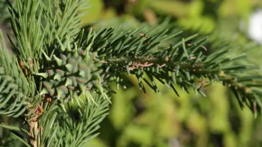 Drzewo jest rośliną rośliną jednopienną. Kwiaty żeńskie, na początku są koloru purpurowego, a z czasem zielenieją. Kwiaty męskie są mniejsze, jasnożółte. Rozwijają się równocześnie z igłami wczesną wiosną (marzec).