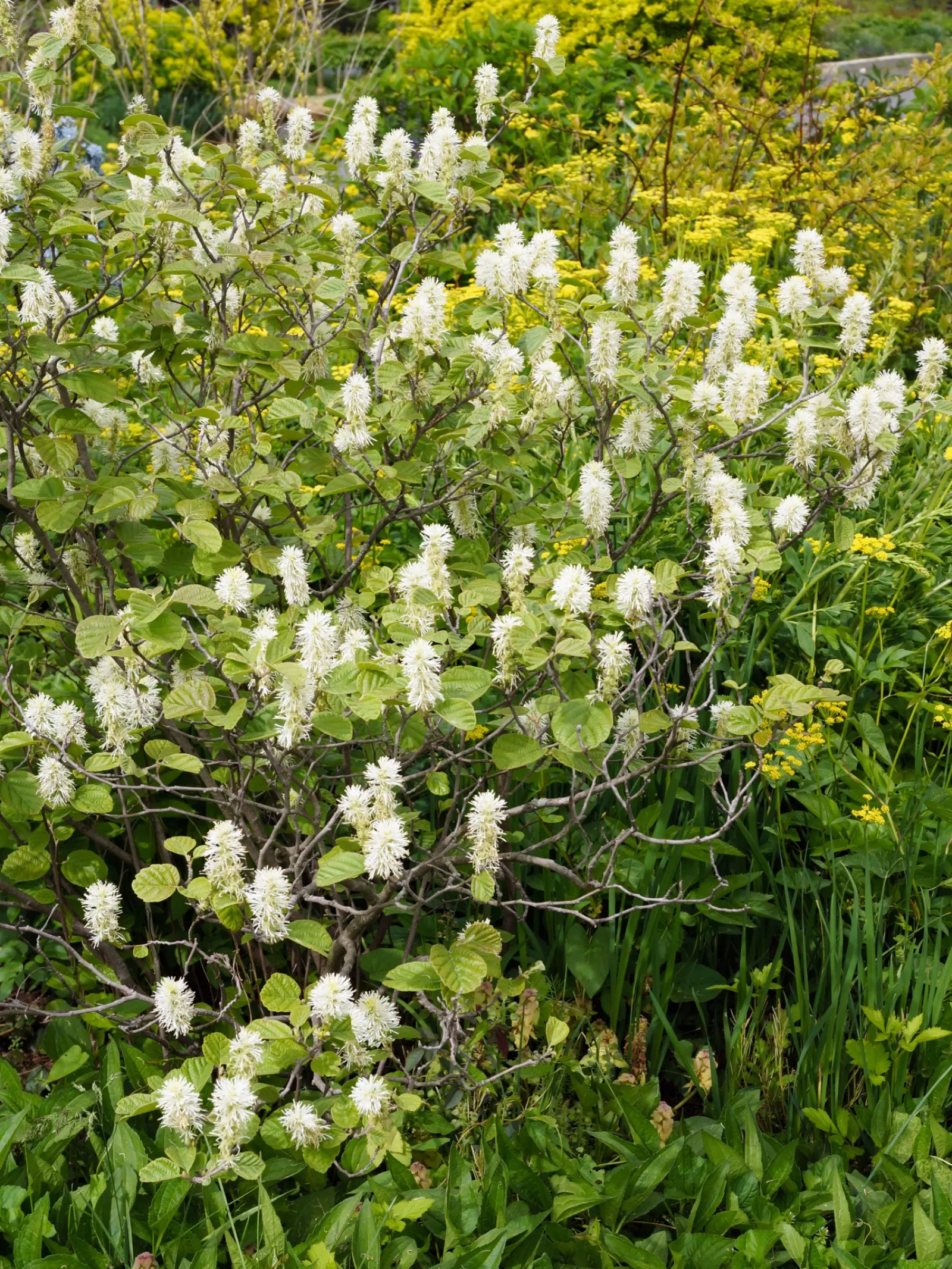Fotergilla Gardena, zwana także olszolistną, to wolno rosnący, niski krzew, który zazwyczaj osiąga od 0,6-1,5 m wysokości, przy podobnej lub nieco większej szerokości. Ma zwarty, wyprostowany pokrój i gęsto ulistnione pędy, które z czasem delikatnie się rozkrzewiają.