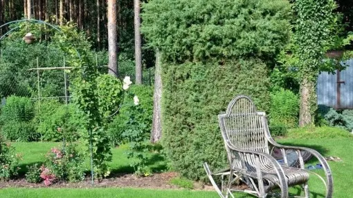 Przy ogrodzeniu posadzone zostały w kilku miejscach ogrodu świerki serbskie, które wytwarzają bardzo wąskie korony, nie zajmują zbyt dużo miejsca i stanowią osłonę przed wzrokiem sąsiadów. Są też ładnym, ciemnym tłem dla czerwonolistnych krzewów i gatunków kwitnących na biało.