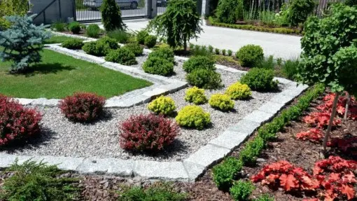Na rabatach od frontu królują m. in.: Żywotnik zachodni „golden globe” (1), Jałowiec płożący „Wiltonii” (8), Bukszpan wiecznie zielony (9), Wierzba mandżurska (16), Rododendron w odmianach (17), Tawułka Arendsa (20), Bergenia sercowata (23), Wrzos w odmianach (29), Kosaciec bródkowy (32), Ciemiernik ogrodowy (39), Skalnica Arendsa (44), Macierzanka piaskowa (47).