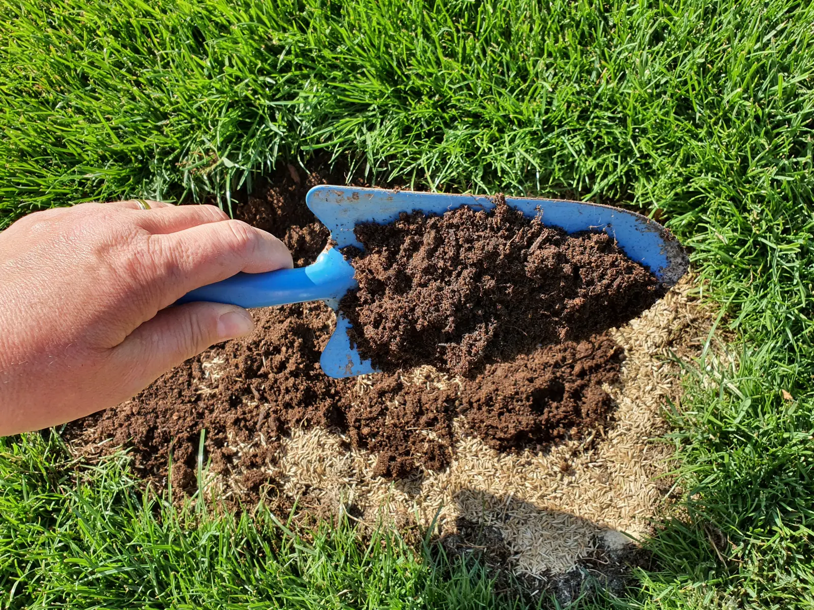 Do dosiewania i naprawy ubytków na trawniku najlepiej sprawdzają się mieszanki regeneracyjne, które zawierają szybko kiełkujące gatunki traw – najczęściej życicę trwałą (rajgras angielski) oraz kostrzewy.