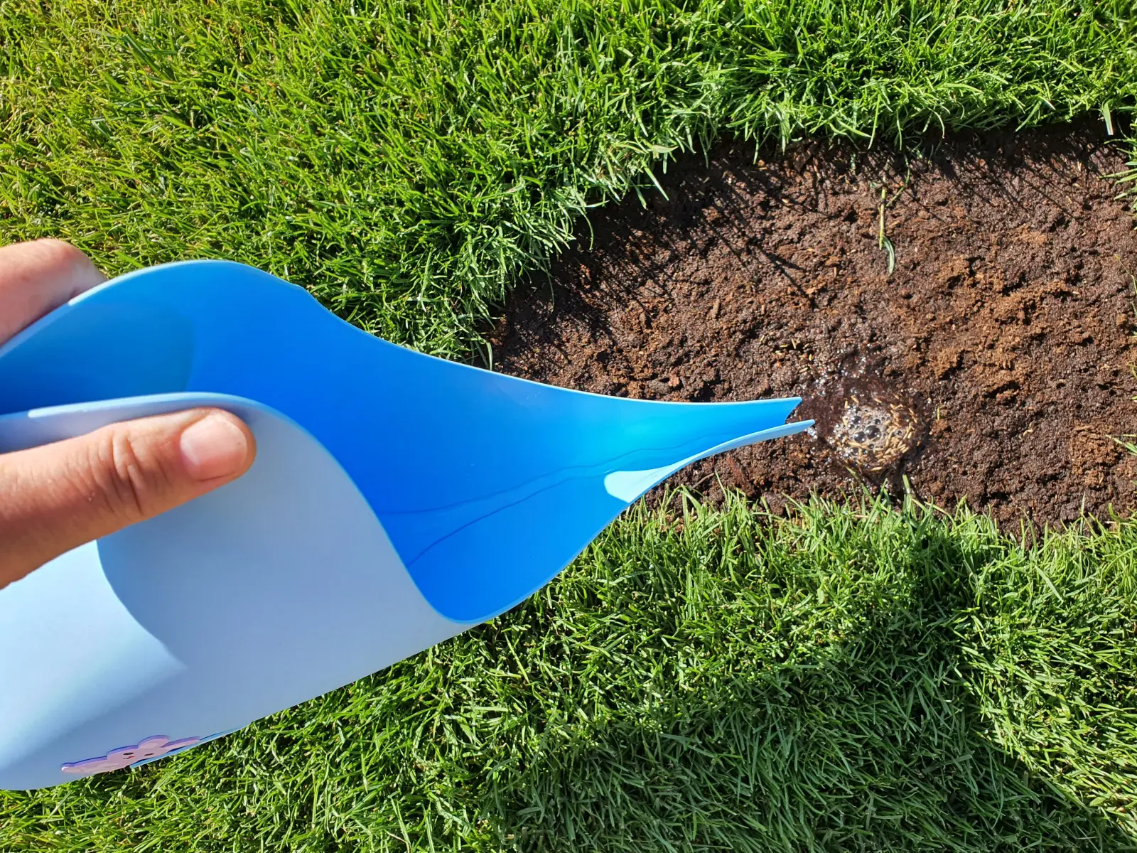 Naprawę zaczynamy od dokładnego usunięcia martwej darni i oczyszczenia miejsca, w którym trawa przestała rosnąć. Trzeba wyciąć zniszczoną powierzchnię szpadlem lub nożem na głębokość ok. 3–5 cm, a następnie spulchnić i rozluźnić glebę w obrębie łatki. Na tym etapie warto też dokładnie podlać ziemię – jak na zdjęciu, by zapewnić nasionom lepsze warunki startowe.