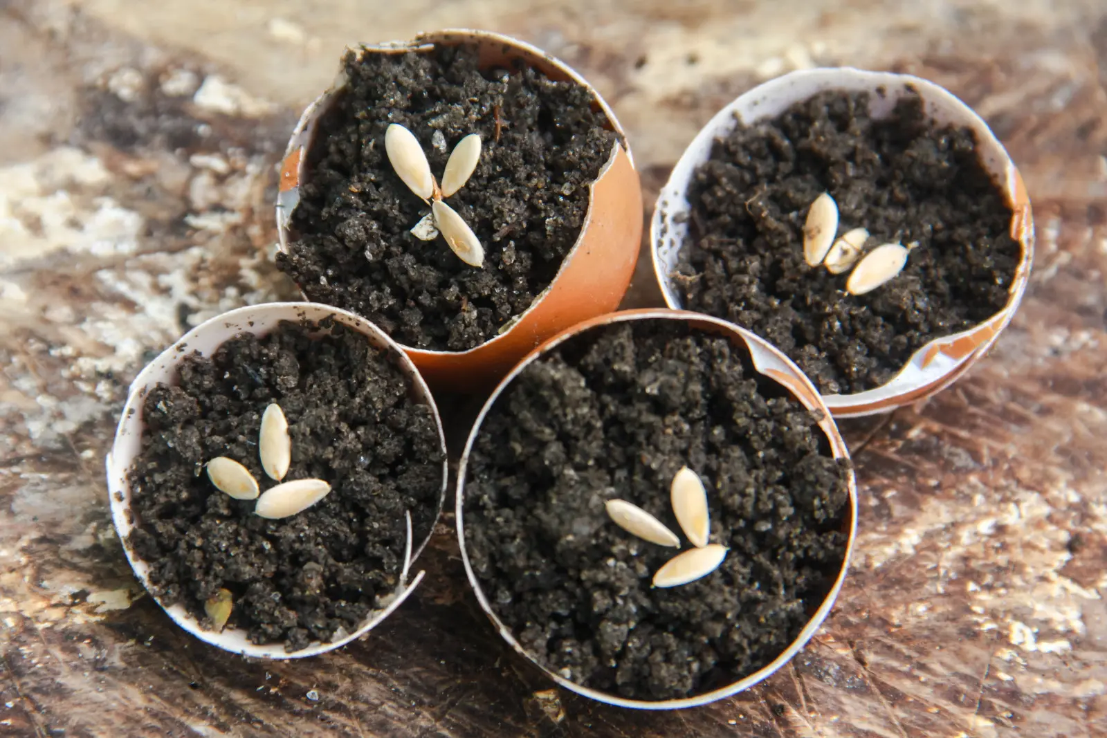 Do środka trafia zwykła ziemia do wysiewu, lekka i przepuszczalna. Do każdej skorupki dobrze wrzucić 2–3 nasiona, bo nie każde musi wzejść. Gdy pojawią się siewki, zostawia się najmocniejszą.