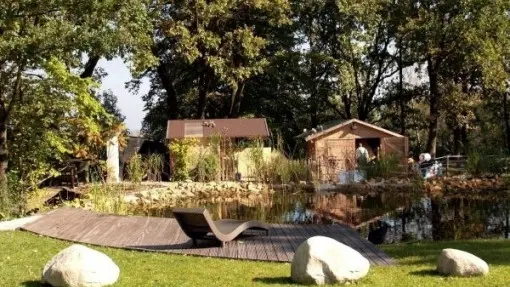 – Po uporządkowaniu wierzbowych zarośli, posadziliśmy trochę roślin iglastych, m.in. cisy i modrzewie – opowiada Marek. – Niedługo potem, na nieco szerszym lewym brzegu, postawiłem z cieślami letni drewniany domek typu Mikołajki, wykonany z gotowych elementów – uczestniczyłem w pracach, ponieważ z wykształcenia jestem budowlańcem. Na etapie kompletowania w fabryce jego części składowych, celowo zamówiłem mocno przeszkloną frontową i przykuchenną ścianę, bo zależało mi na panoramicznym widoku na staw i jego otoczenie.