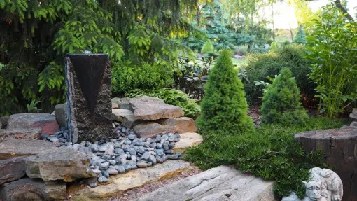 W ogrodach Kraju Kwitnącej Wiśni ważnym składnikiem kompozycji wodnej są naturalne kamienie oraz staw o nieregularnej linii brzegowej. Beata nie zamierzała u siebie odzwierciedlać tego stylu kropka w kropkę, bardziej zależało jej na wykreowaniu charakterystycznego nastroju. Cel osiągnęła, dodając kolejne rośliny i elementy małej architektury typowe dla dalekowschodnich założeń ogrodowych.