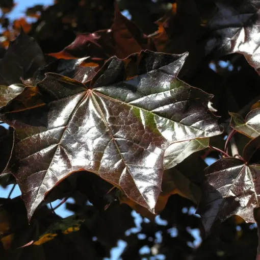 Klon pospolity 'Crimson King' - to odmiana o szerokiej koronie i ciemnopurpurowych liściach, które latem stają się szkarłatne.