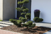 Kompozycja przed domem musi być efektowna o każdej porze roku – wiosną, latem, jesienią i zimą. Jeśli lubisz tworzyć sezonowe kompozycje w doniczkach, zaplanuj miejsca na pojemniki, ale ustaw je tak, by nie przeszkadzały wchodzeniu do domu. Jeśli zimą chcesz udekorować ogród świątecznymi lampkami, właśnie przed domem posadź niewielkie iglaste drzewko, które będzie łatwo ozdobić i które będzie witało domowników oraz gości przed progiem Twojego domu.