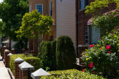 Krzewy w ogrodzie frontowym przy domu