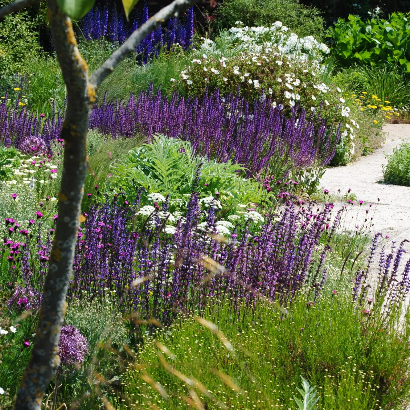 Gwiazdy czerwcowej suchej rabaty to między innymi odporne na susze czosnki ozdobne ‘Purple Rain’ oraz czosnki Krzysztofa, szałwie muszkatołowe (Salvia sclarea) oraz mieszańcowe, czyściec wełnisty – którego srebrzyste, aksamitne i miękkie w dotyku liście fantastycznie kontrastują ze stalowoniebieskim, podobnym do ostu ulistnieniem mikołajków – i zielonkawego wilczomlecza sosnki (Euphorbia cyparissias). Do tego budleja, żeleźniaki, szałwia lekarska lub lawenda wąskolistna o klasycznym zapachu i strzelistych, fioletowych kwiatostanach, oraz zwiewne fioletowoniebieskie chmury perowskii ‘Blue Spire’, białe kwiatki modraka sercolistnego (Crambe cordifolia), różowy czystek i drobniutka, płynąca jak złota rzeka w świetle słonecznym ostnica cieniutka. Do tego inne trawy – np. lodowata, niebieskozielona kostrzewa sina lub miękkie, szczotkowe pióropusze (w późniejszej części sezonu) piórkówki. Tu i ówdzie wybuchają jak noworoczne fajerwerki ostnice olbrzymie i czosnki Szuberta.