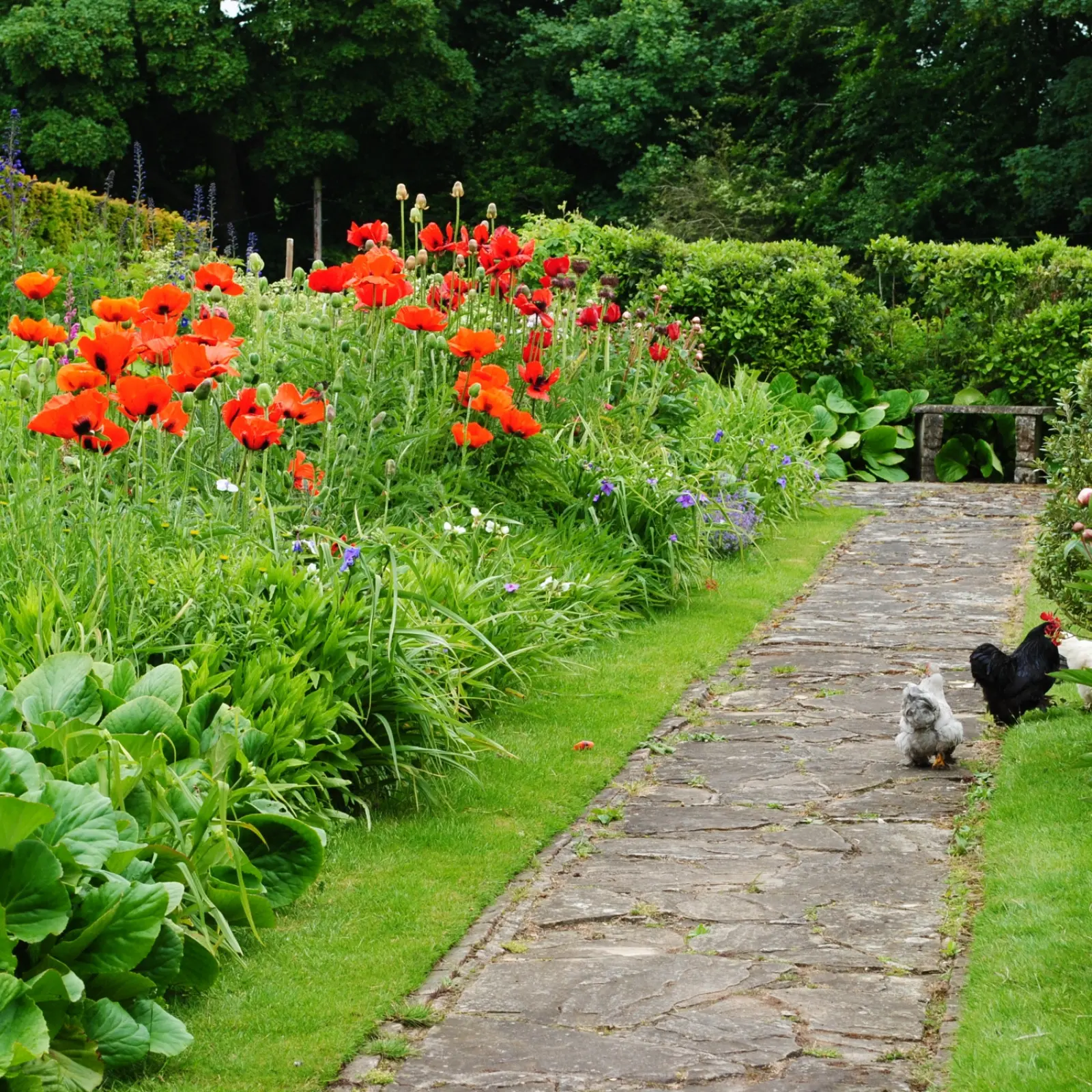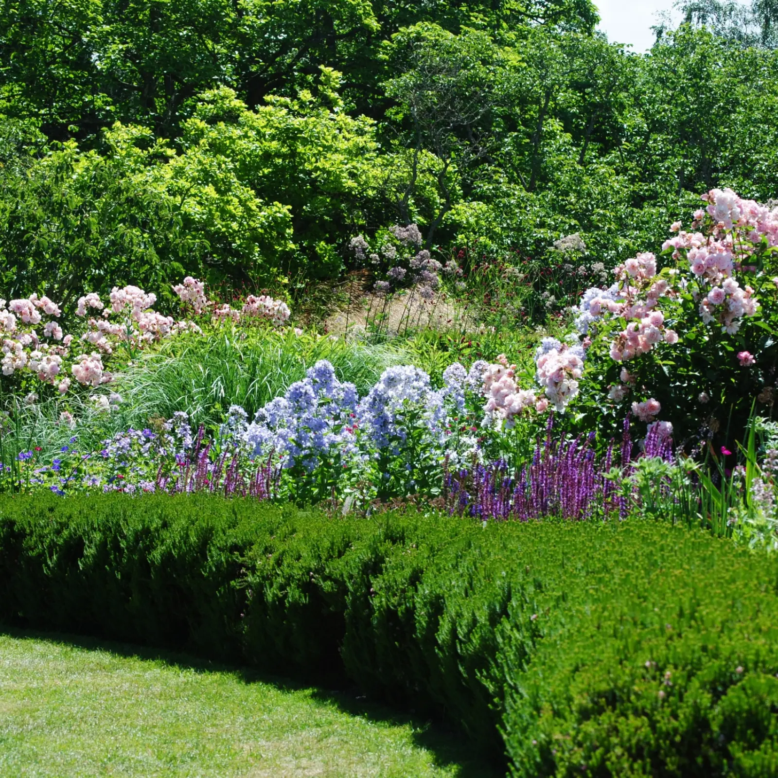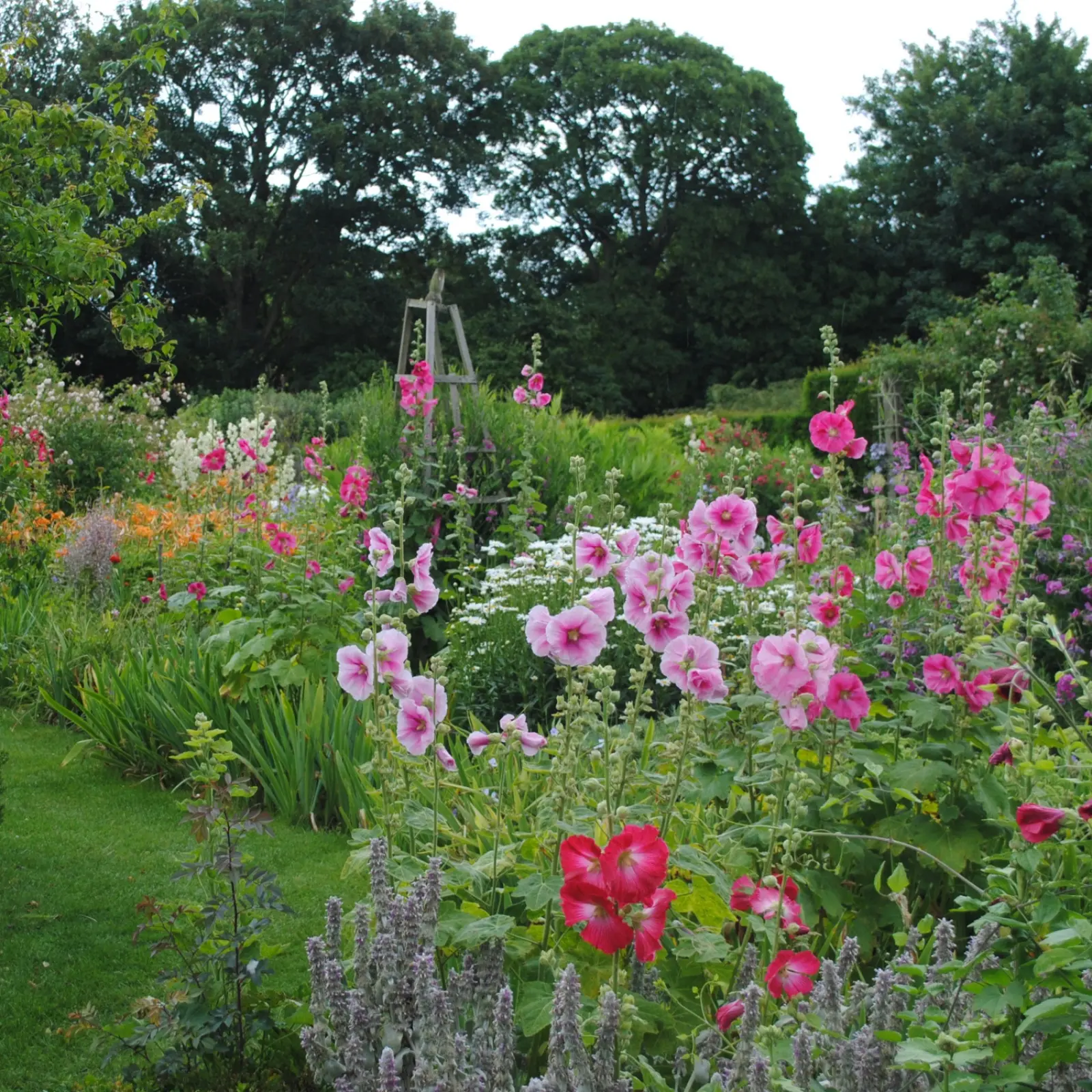 Na tradycyjnych rabatach mieszanych wysokie rośliny, takie jak królujące w czerwcu ostróżki, naparstnice i łubiny, wyrastają z tyłu i są tłem dla bylin znajdujących się w środkowej i przedniej części rabaty – tworzą one strzeliste wieże najcudowniejszych kolorów – chłodnych błękitów, przeróżnych odcieni fioletu i delikatnych różów. Kwiaty w środkowej części rabat, takie jak piwonie, floksy i bodziszki, zapewniają bujne kopce kwiatów, które są wspaniałą kotwicą dla wysokich bylin i łączą je z najniższą, przednią częścią rabat.