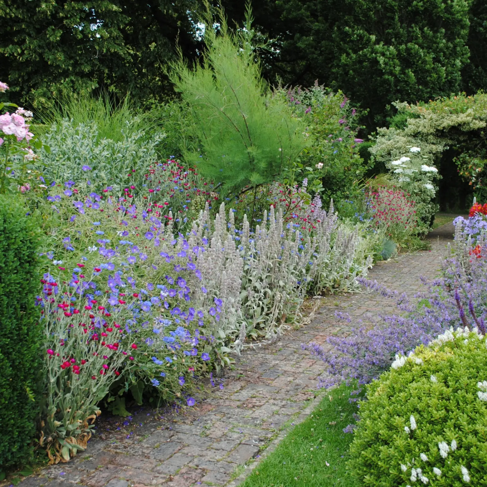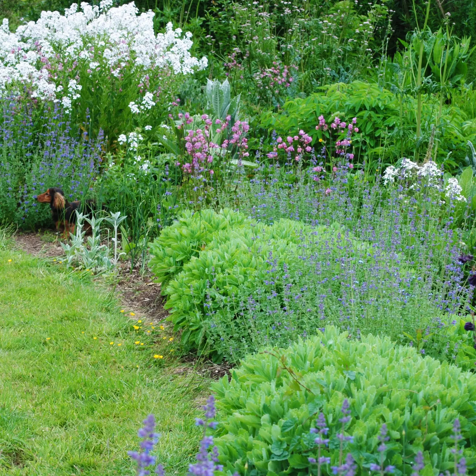 Tutaj z początkiem lata najatrakcyjniej wyglądają kocimiętki, kalaminty, przywrotnik ostroklapowy, czyściec wełnisty i niższe odmiany bodziszków, a czasami nawet bratki – zmiękczają one wizualnie rabaty i wręcz rozlewają się na ścieżki. Dzięki nim rabaty o tej porze roku wydają się szczególnie romantyczne i urocze, jak malowane płótno – żywe, dynamiczne i pełne kontrastów, w którym żadna roślina nie dominuje, lecz subtelnie uzupełnia inne.