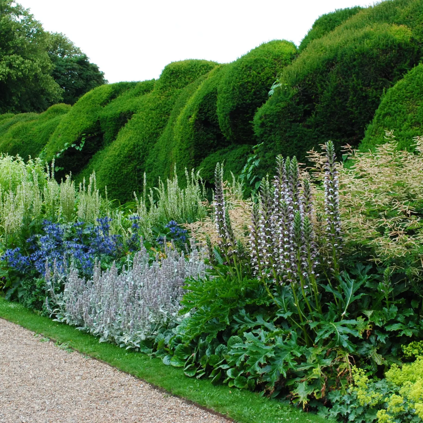 Przedni, najniższy rząd roślin na rabacie powinien dorastać zaledwie do około 50 cm, aby swobodnie wylewać się na ścieżki, tym samym łagodząc ostre krawędzie rabat. I tutaj tradycyjnie musi rosnąć przywrotnik ostroklapowy o limonkowozielonych, pienistych kwiatach i karbowanych liściach. Polecam również bodziszek ‘Rozanne’, który ma rozłożyste, fioletowoniebieskie kwiaty, lawendę, czyściec wełnisty oraz białe goździki brodate ‘Mrs Sinkins’, które cudnie pachną i wprowadzają na rabaty uroczy klimat vintage.