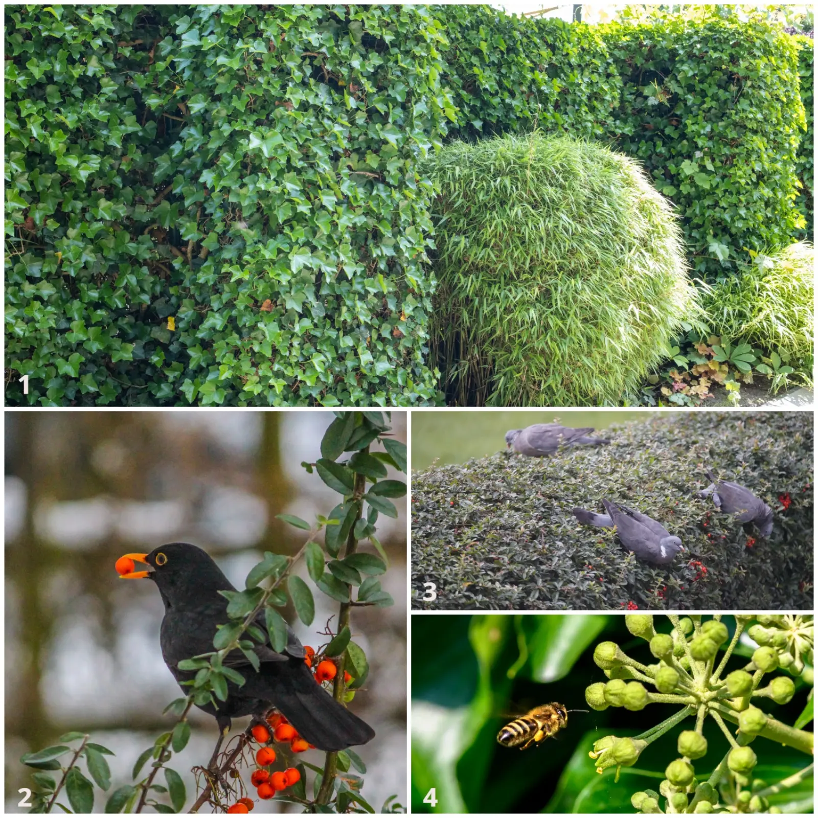 Jeśli zależy nam więc na szybkim efekcie, w zacienionej części ogrodu lepiej stworzyć ścianę z choiny kanadyjskiej (Tsuga canadensis) lub bluszczu pospolitego (Hedera helix). Ten ostatni gatunek jest silnie rosnącym pnączem i może porosnąć nie tylko ścianę, ale służy także do okrywania podłoża. W towarzystwie paproci czy rododendronów można z niego wyczarować efektowną i trwałą kompozycję. Kolejną zaletą bluszczu jest to, że zajmuje niewiele miejsca. Poza tym starsze egzemplarze zakwitają i wtedy, jesienią, stanowią cenny pokarm dla pszczół.