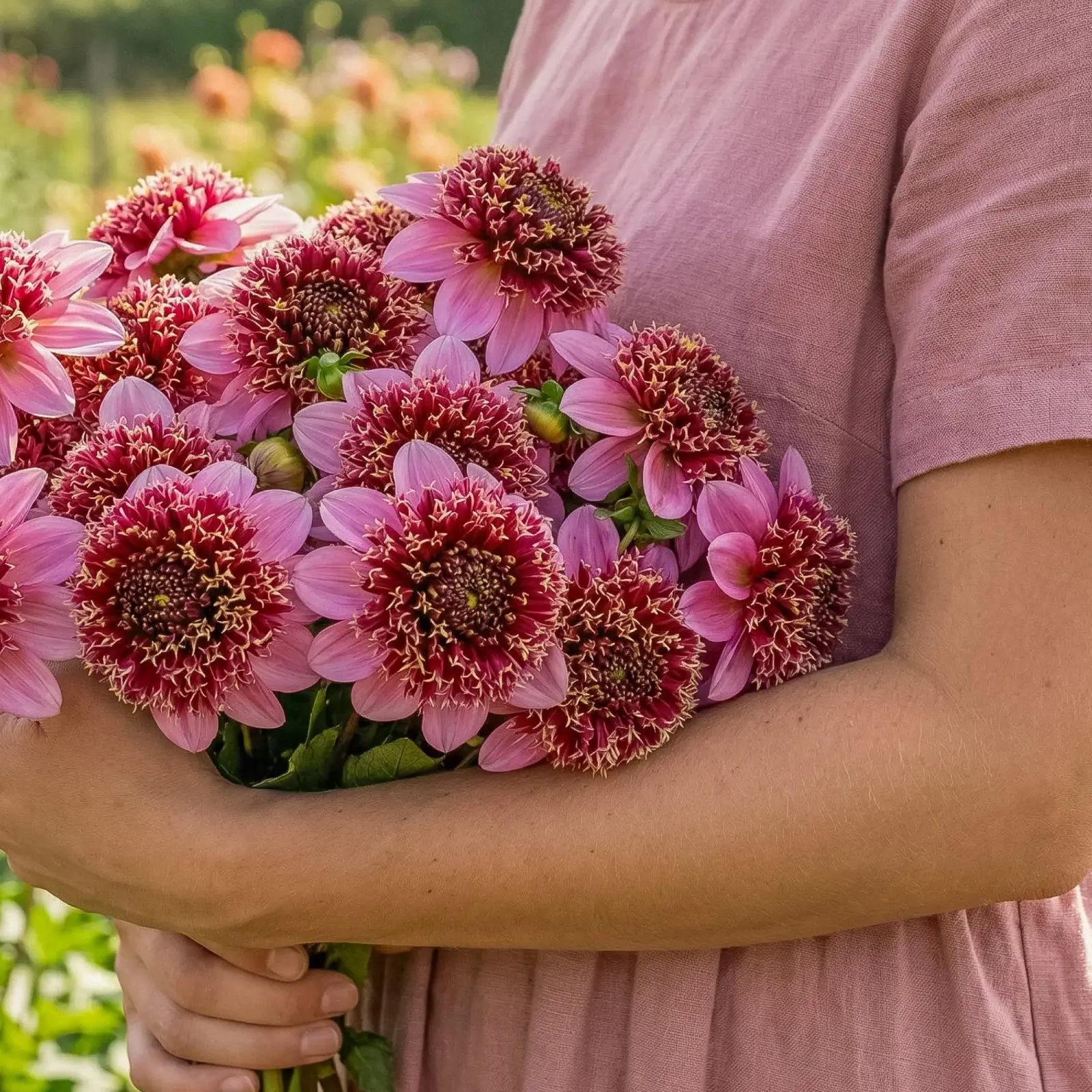 Przypomina kwitnącą jabłoń wiosną, ale w letnim, daliiowym wydaniu. Jej różowe, pomponowe kwiaty wnoszą do ogrodu świeżość i lekkość, jak sad budzący się do życia. Idealna do naturalistycznych rabat przy drzewach owocowych, a także do delikatnych bukietów.