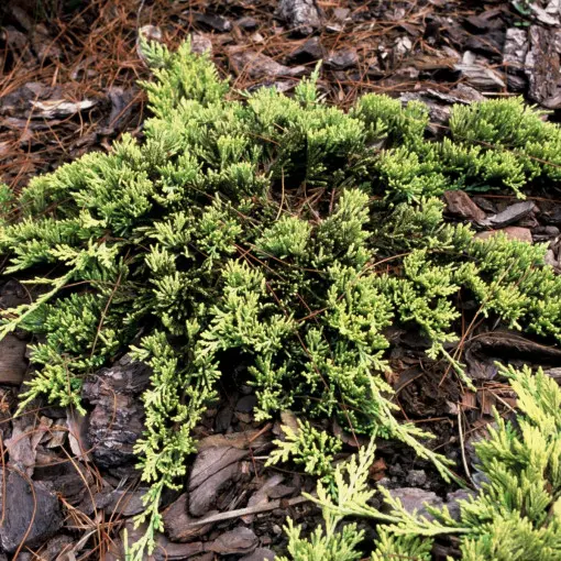 2. Jałowiec płożący (Juniperus horizontalis) odmiana 'Dunvegan Blue' dorasta do 30-40 cm wysokości i 2,5-3 m szerokości. Posiada krótkie, srebrzysto-niebieskie igły, które zimą zmieniają odcień na śliwkowy. To ceniony płożący krzew.