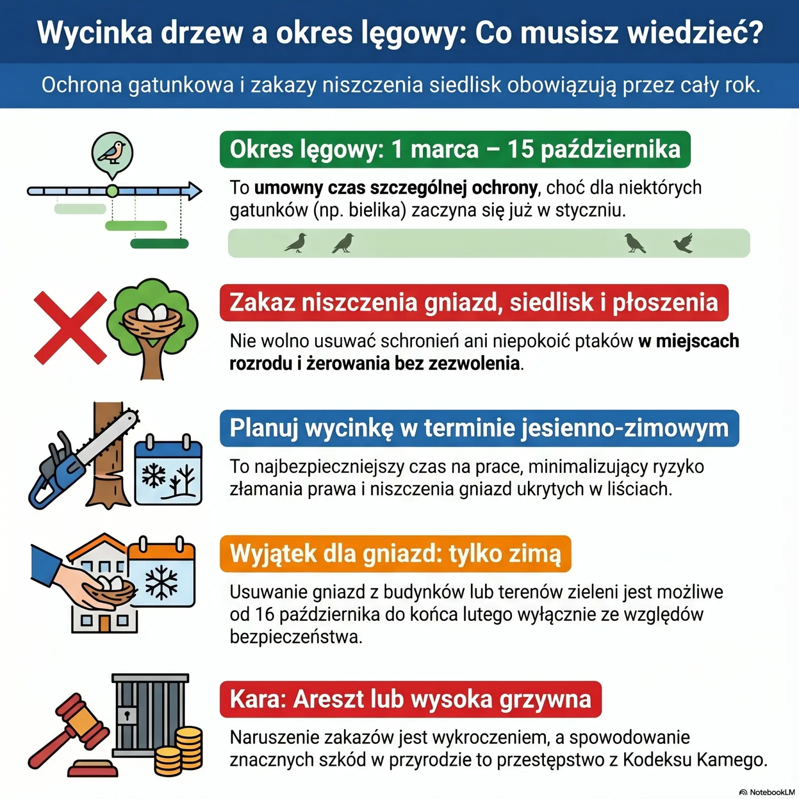 W praktyce jednak okres wiosenno-letni wiąże się z dużym ryzykiem złamania prawa, ponieważ ptaki bardzo często przebywają w koronach drzew i gęstych krzewach. Dodatkowo liście utrudniają zauważenie gniazd, które mogą być dobrze ukryte. Z tego względu najbezpieczniejszym i zalecanym terminem wycinki pozostaje jesień i zima, kiedy aktywność lęgowa ptaków jest znacznie mniejsza.