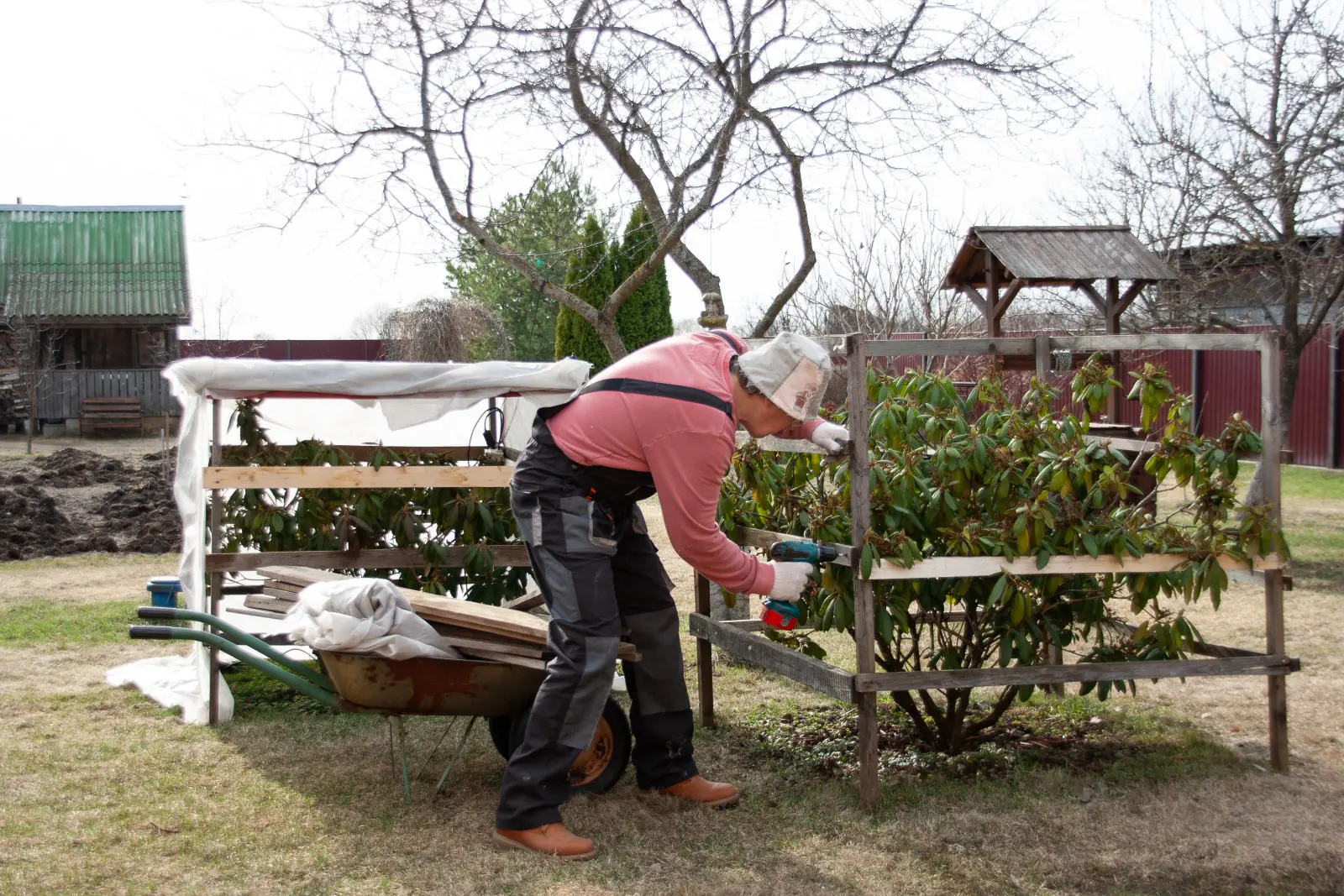 Konstrukcja nie tylko podtrzyma osłonę z materiału, ale również ochroni roślinę przed złamaniem gałęzi pod wpływem śniegu. Taki domek możesz postawić zarówno przy pojedynczym krzewie, jak i większej grupie roślin. Wystarczy dociąć deski, przykręcić je do pionowych słupków i obciągnąć całość lekkim materiałem przepuszczającym światło i powietrze.