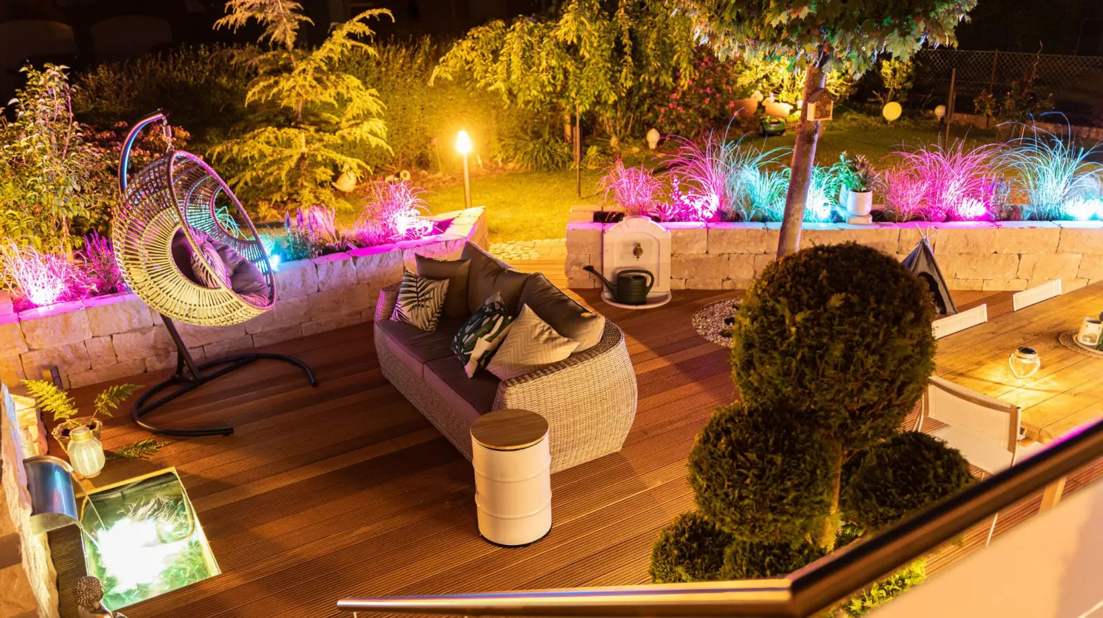 W smart ogrodzie również światło działa mądrze. Inteligentne systemy oświetleniowe pozwalają nie tylko na włączanie i wyłączanie lamp o określonych porach, ale także na: