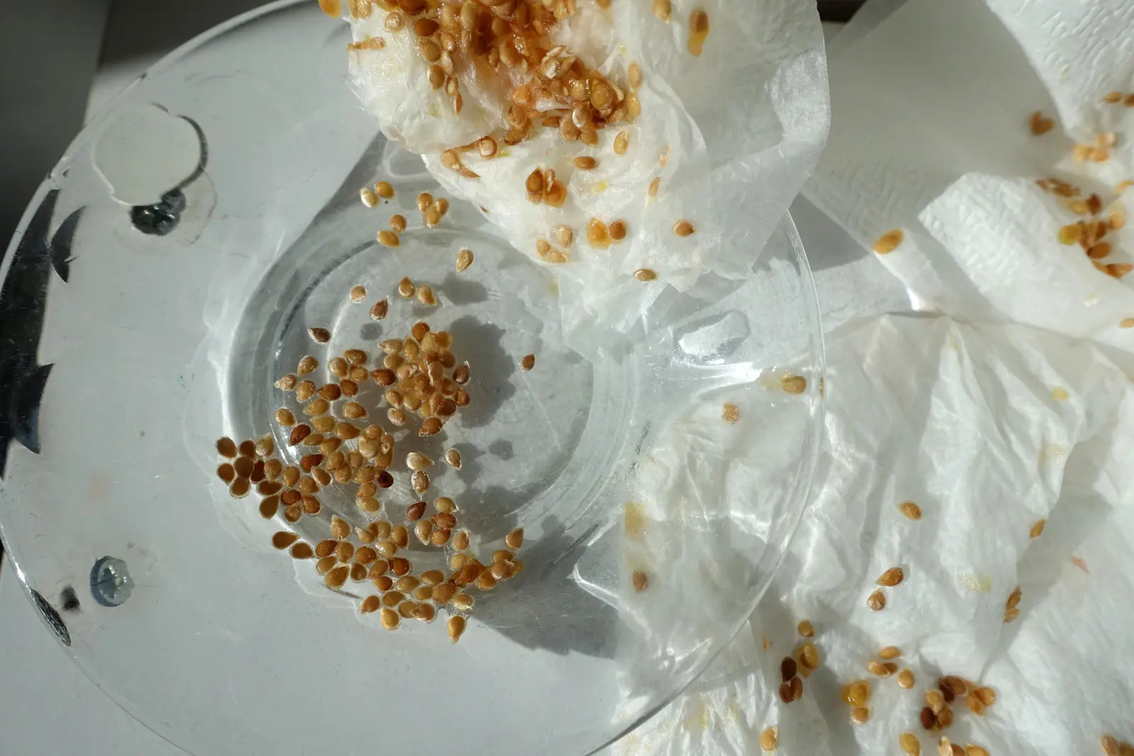 - Zebrany materiał siewny po zbiorze należy pozostawić na kilka dni w suchym, ciepłym i przewiewnym miejscu do całkowitego doschnięcia – np. w kartonowym pudełku lub rozsypany na papierze.