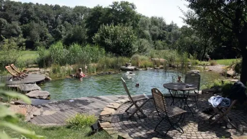 Efekt naturalnego zbiornika wodnego uzyskuje się przede wszystkim poprzez wytyczenie nieregularnej linii brzegowej. Ważne jest także odpowiednie obsadzenie go roślinnością. Stopniowe opadanie dna zbiornika wodnego umożliwia zastosowanie tych gatunków roślin, które mogą rosnąć na różnych głębokościach.