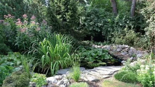 Samo obrzeże stawu dobrze zakryją rośliny wodne posadzone w wodzie, przy jego brzegu, w jutowych workach oraz rośliny płożące, sadzone na zewnątrz.